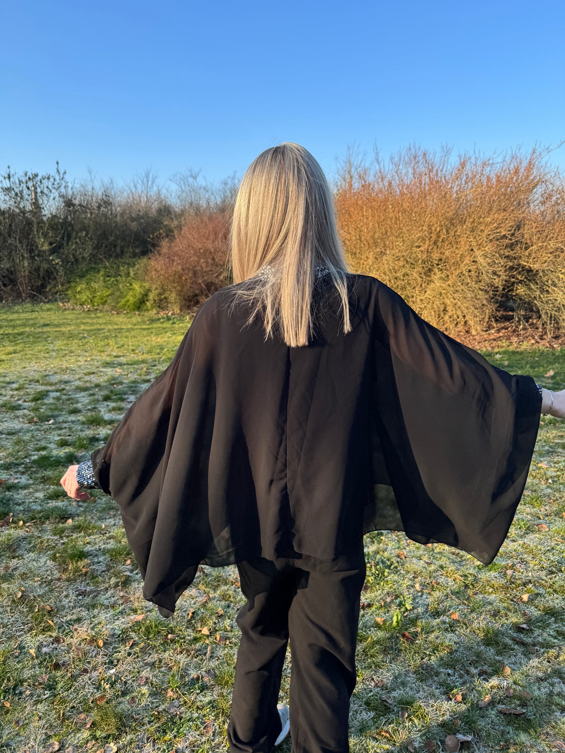 Confectionné dans une matière fluide et semi-transparente sur les manches, il apporte une touche sophistiquée tout en restant confortable. Les manches larges façon cape renforcent son style chic et moderne, tandis que les finitions scintillantes ajoutent juste ce qu’il faut d’éclat pour illuminer la tenue, de jour comme de nuit.