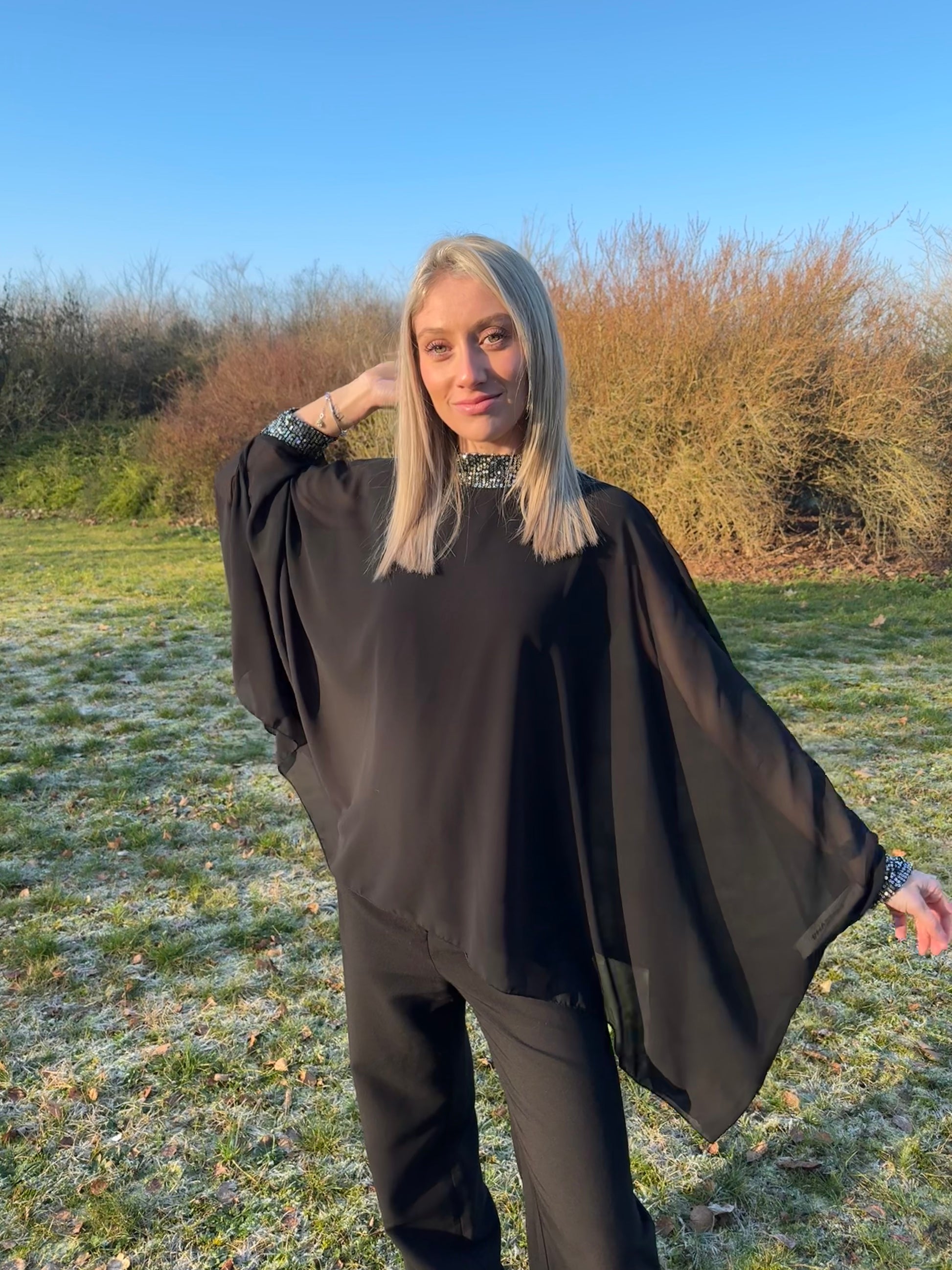 Ce haut noir séduit par son allure fluide et aérienne, sublimée par de délicats détails pailletés au col et au bas des manches. Sa coupe ample et élégante crée un tombé léger qui accompagne les mouvements avec grâce, offrant une silhouette féminine et raffinée.