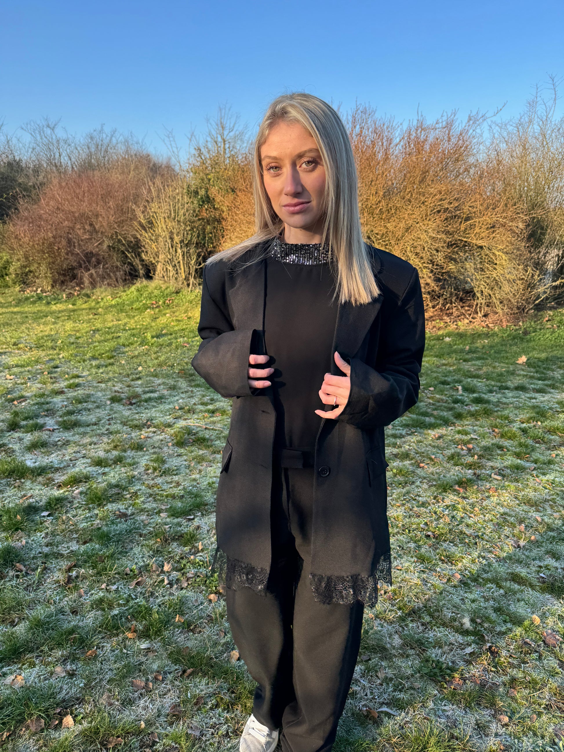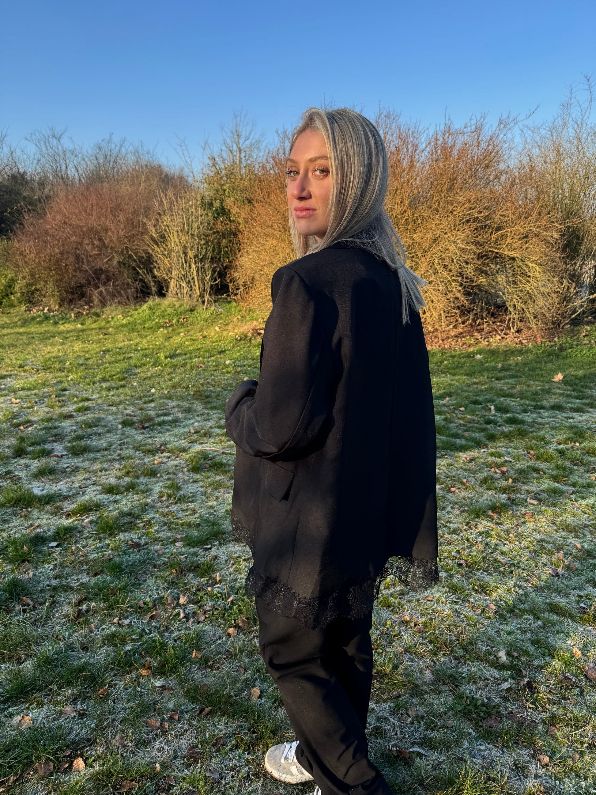Ce blazer noir revisite le tailoring classique avec une touche de féminité raffinée grùce à sa finition en dentelle délicate sur le bas. Sa coupe droite légÚrement oversize apporte une allure moderne et élégante, idéale pour sublimer toutes les silhouettes.