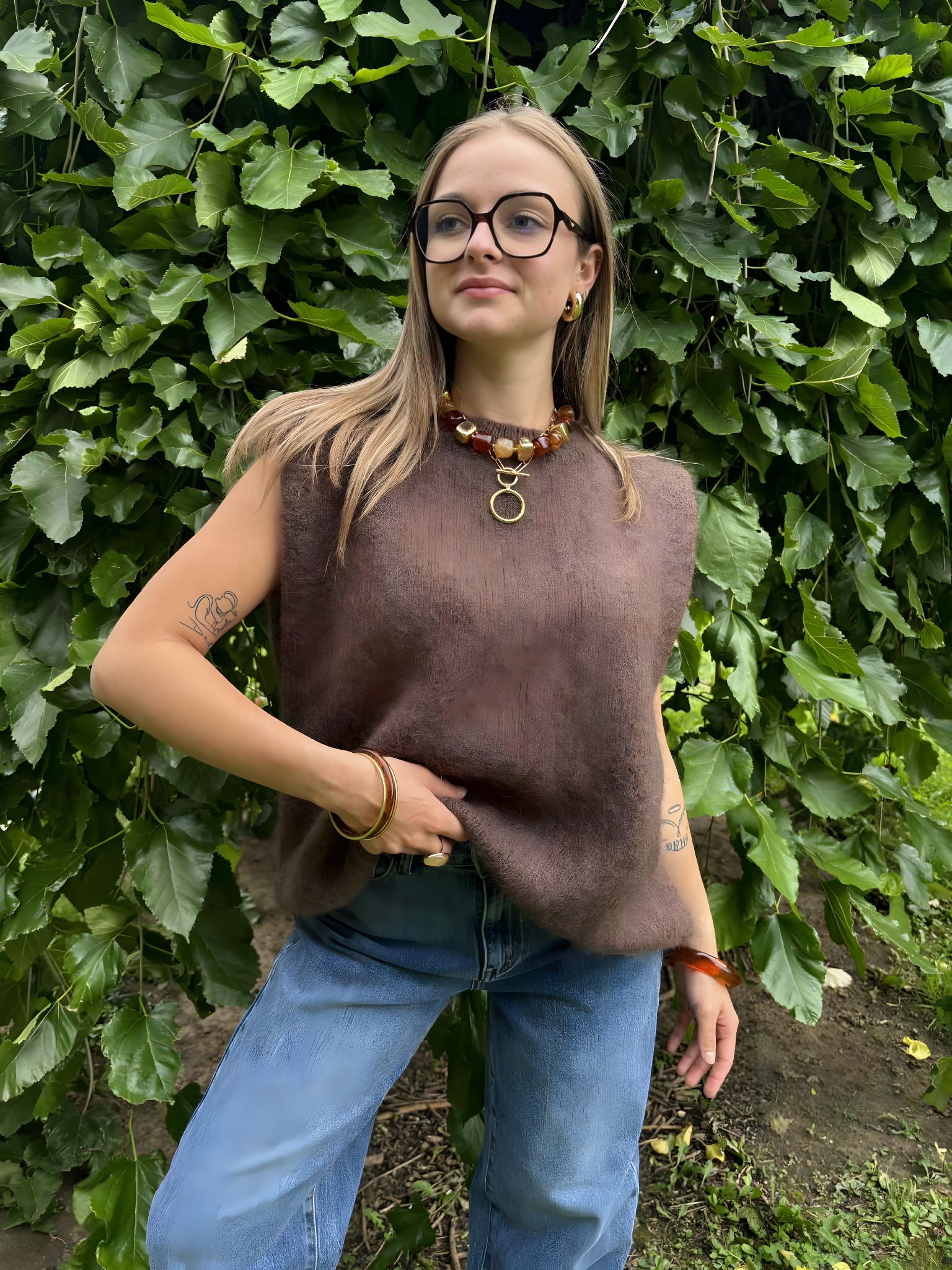 Un indispensable chic et tendance ! Ce pull sans manches couleur chocolat séduit par sa matiÚre douce et légÚrement duveteuse. Avec son col rond classique et sa coupe ample, il est parfait porté seul ou superposé sur une chemise pour un look stylé.